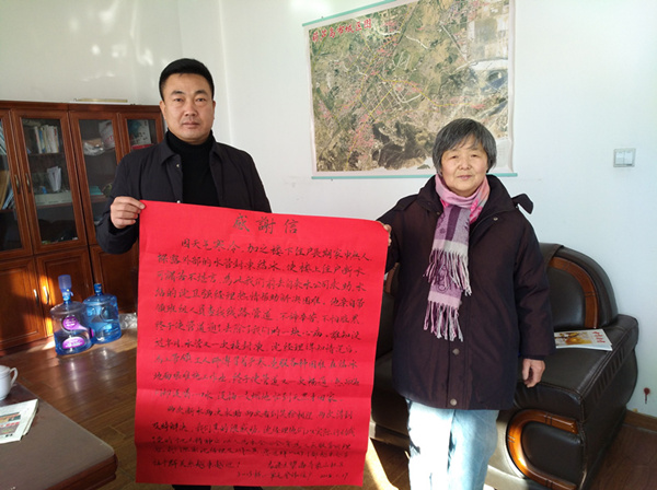 1月30日上午,家住龍港區(qū)望海寺象山社區(qū)3-13棟一單元5樓的一位70多歲的老人在女兒的陪同下,來到自來水公司,專程送來一封熱情洋溢的感謝信,代表全體住戶對自來水公司營業(yè)三分公司維修人員不辭辛苦,兩次及時維修被凍損管線,解決該樓用水問題及熱情周到的服務表示感謝。
