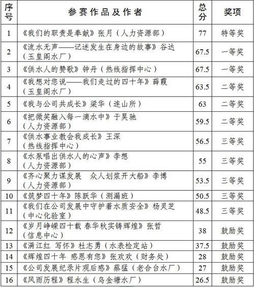 本次評選,公司本著公平、公正原則,特聘請5位來自《葫蘆島日報》、《葫蘆島晚報》副總編及記者評委對無署名的16篇作品進行評審,最高分值16分,分差為整分或半分(0.5分),每篇作品最后得分為5位評委評分之和。經(jīng)統(tǒng)計分數(shù),評選出特等獎1名(獎金500元),一等獎2名(獎金300元),二等獎3名(獎金200元),三等獎5名(獎金100元),鼓勵獎5名(獎金50元),公司對征文比賽獲獎人員予以通報表彰。