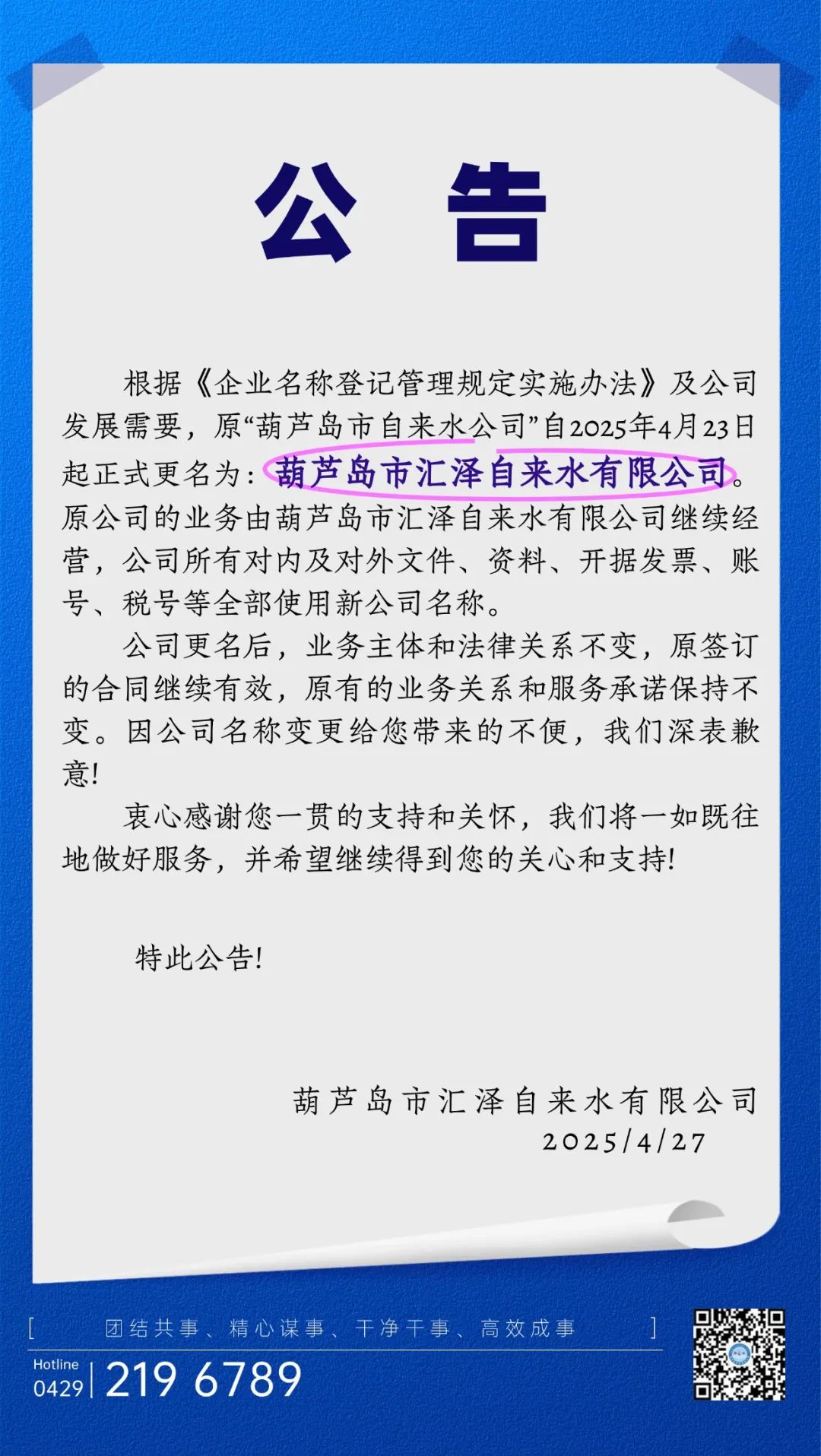 葫蘆島市自來(lái)水公司關(guān)于名稱變更的公告