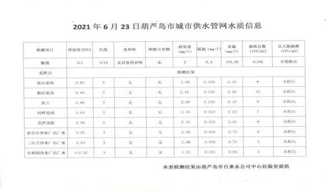 2021年6月23日葫蘆島市城市供水管網(wǎng)水質(zhì)信息
