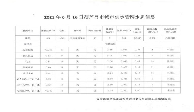 2021年6月16日葫蘆島市城市供水管網(wǎng)水質(zhì)信息
