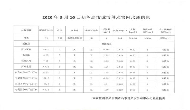 2020年9月16日葫蘆島市城市供水管網(wǎng)水質(zhì)信息