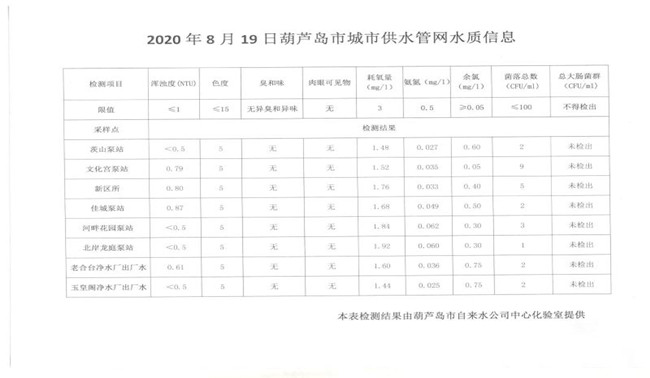 2020年8月19日葫蘆島市城市供水管網(wǎng)水質(zhì)信息