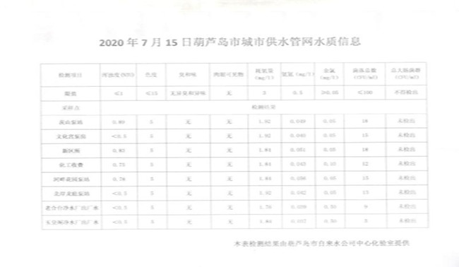 2020年7月15日葫蘆島市城市供水管網(wǎng)水質(zhì)信息