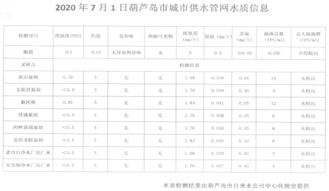 2020年7月1日葫蘆島市城市供水管網(wǎng)水質(zhì)信息