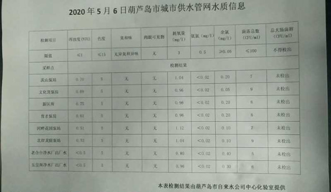 2020年5月6日葫蘆島市城市供水管網(wǎng)水質(zhì)信息