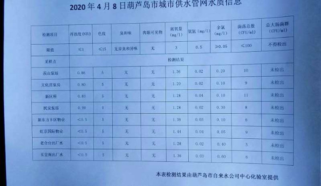 2020年4月8日葫蘆島市城市供水管網(wǎng)水質(zhì)信息