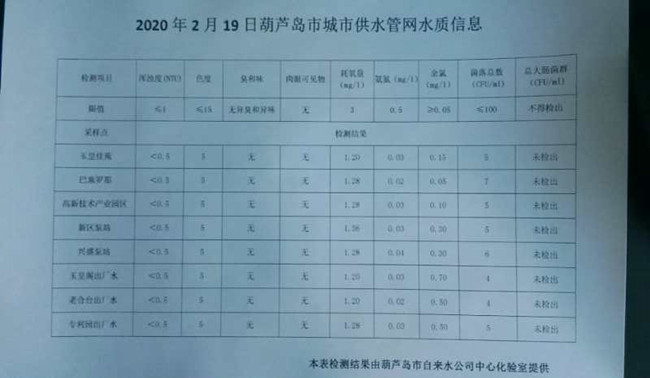 2020年2月19日葫蘆島市城市供水管網(wǎng)水質信息