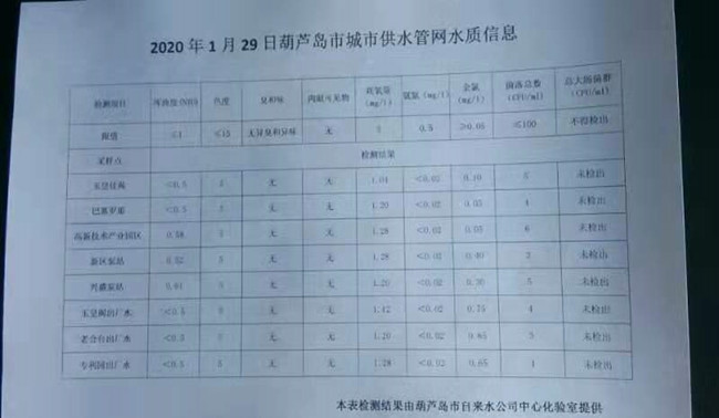 2020年1月29日葫蘆島市城市供水管網(wǎng)水質(zhì)信息