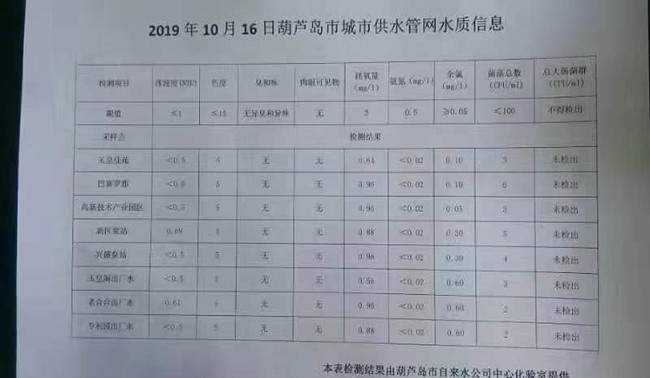 2019年10月16日葫蘆島市城市供水管網(wǎng)水質(zhì)信息