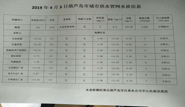 2019年4月3日葫蘆島市城市供水管網(wǎng)水質(zhì)信息