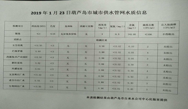2019年1月23日葫蘆島市城市供水管網(wǎng)水質(zhì)信息