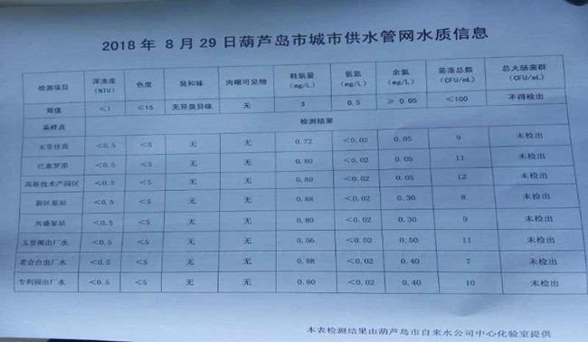 2018年8月29日葫蘆島市城市供水管網(wǎng)水質(zhì)信息