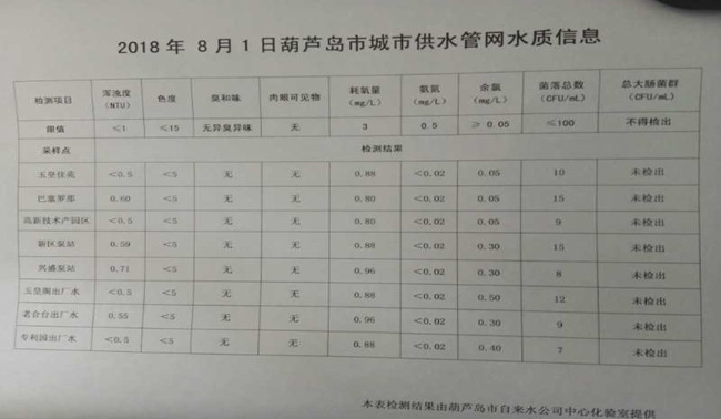 2018年8月1日葫蘆島市城市供水管網(wǎng)水質(zhì)信息