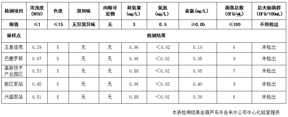 2017年11月1日葫蘆島市城市供水管網(wǎng)水質(zhì)信息