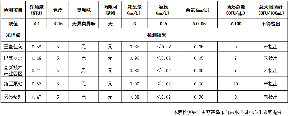 2017年6月7日葫蘆島市城市供水管網水質信息