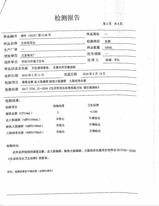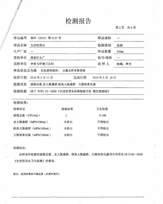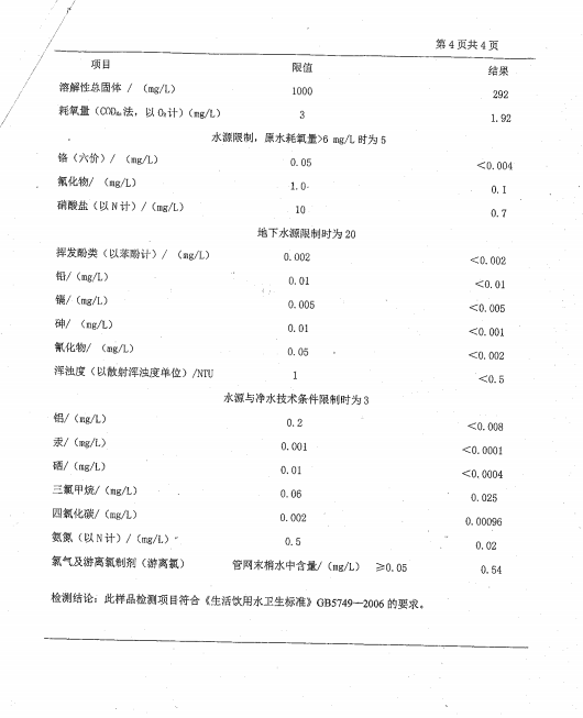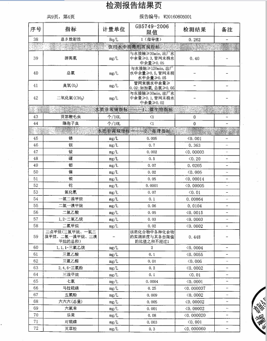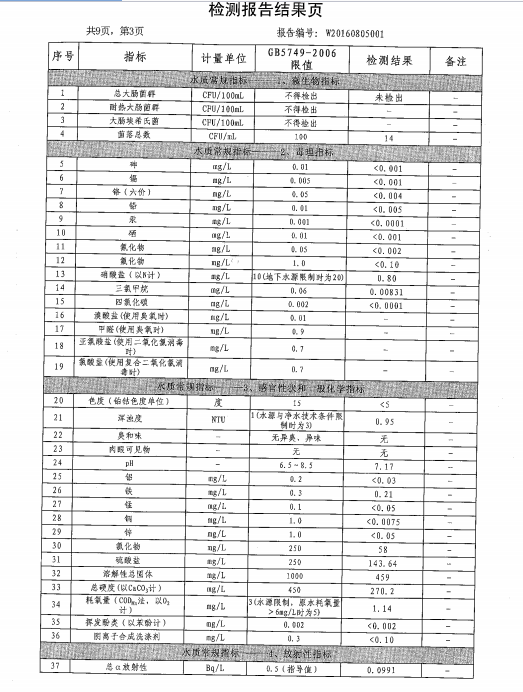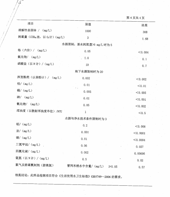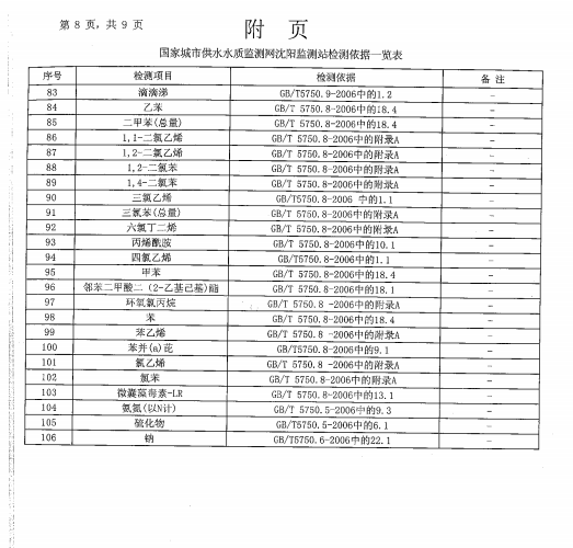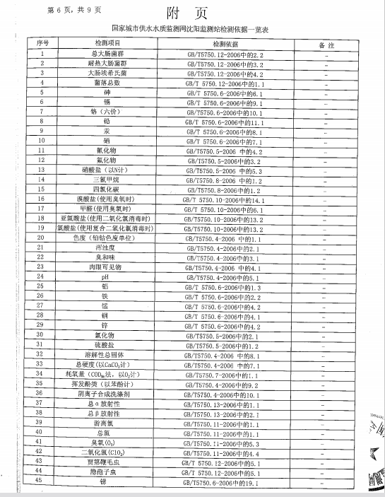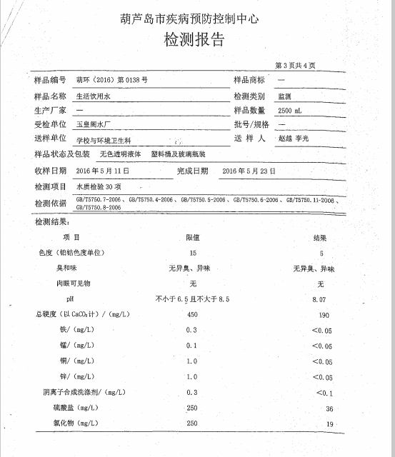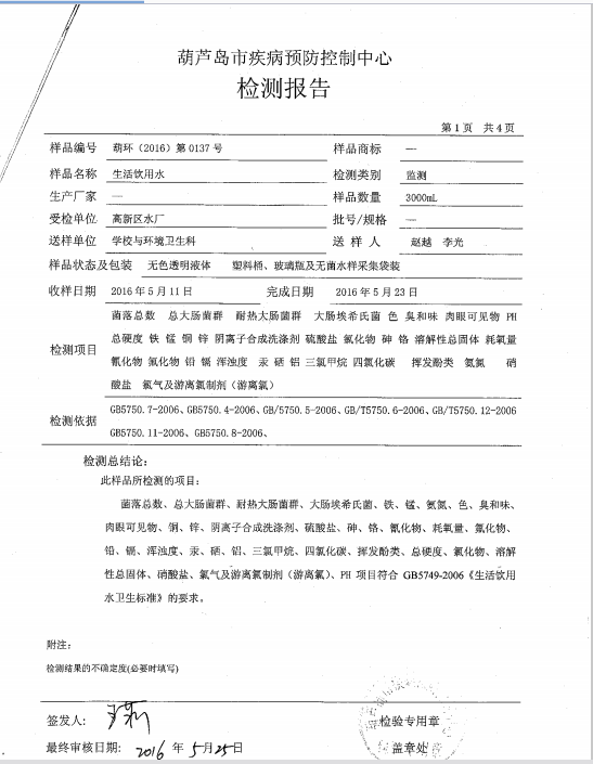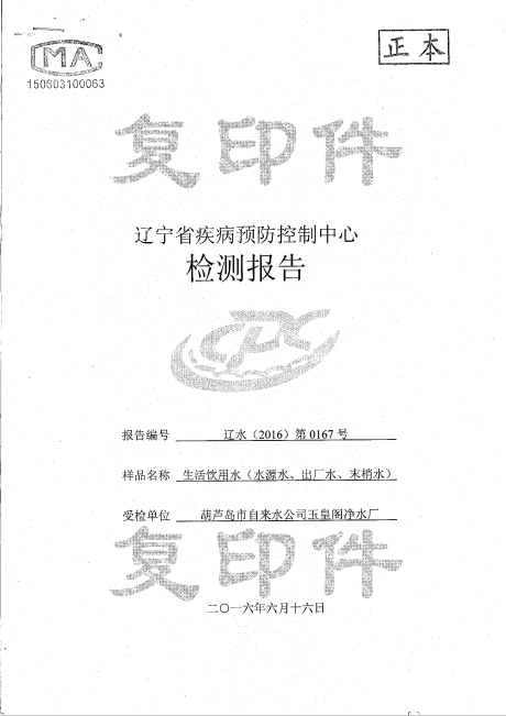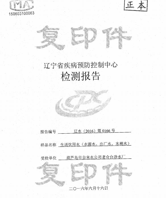 葫蘆島市自來水公司2016年水質(zhì)檢測報告公示